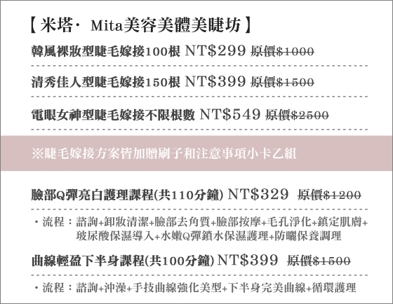 商品訊息簡述: 只要299元起即可體驗【米塔·Mita美容美體美睫坊】原價最高2500元SPA/美睫課程:(A)韓風裸妝型睫毛嫁接100根/(B)清秀佳人型睫毛嫁接150根/(C)電眼女神型睫毛嫁接不限根數/(D)臉部Q彈亮白護理課程/(E)曲線輕盈下半身課程,睫毛嫁接方案皆加贈刷子和注意事項小卡乙組。