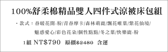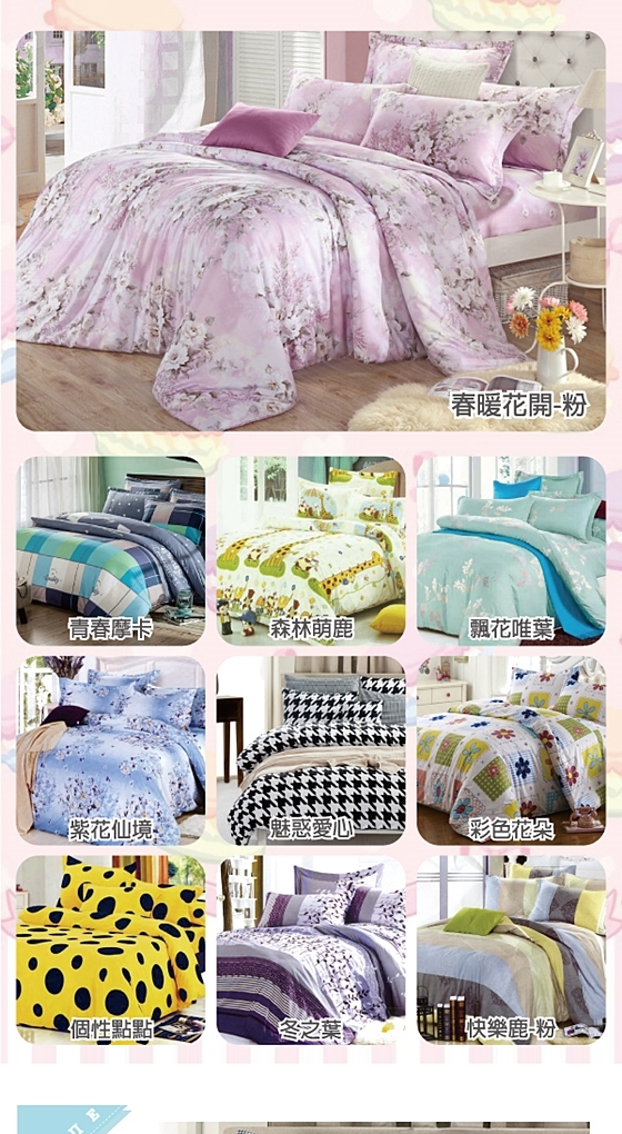 : 只要790元(含運)即可購得原價2480元100?柔棉精品雙人孕韟〃D被床包組1組,款式:春暖花開-粉/青春摩卡/森林萌鹿/飄花唯葉/紫花仙境/魅惑愛心/彩色花朵/個性點點/冬之葉/快樂鹿-粉。
