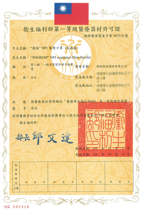 專利證書X口罩檢驗報告
