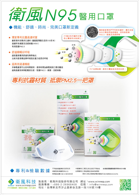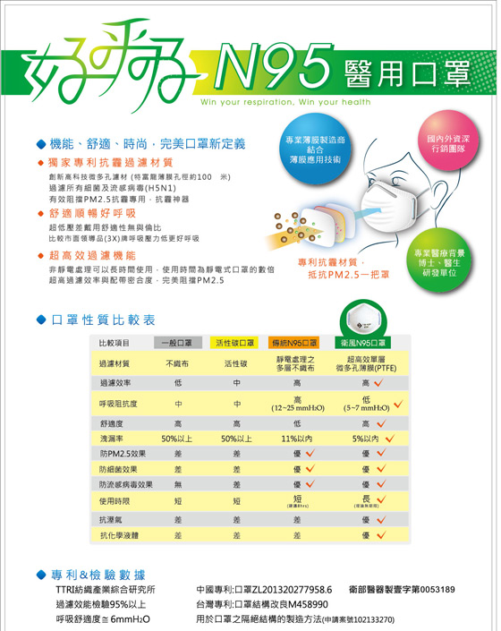 第三層:PTFE創新獨家專利奈米等級濾材,高於傳統N 95口罩的呼吸舒適度,並有效阻擋PM2.5、細菌及流感病毒。