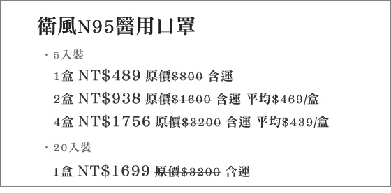 商品訊息簡述: 只要489元起(含運)即可購得原價最高3200元衛風N95醫用口罩:(A)5入裝:1盒/2盒/4盒/(B)20入裝:1盒。