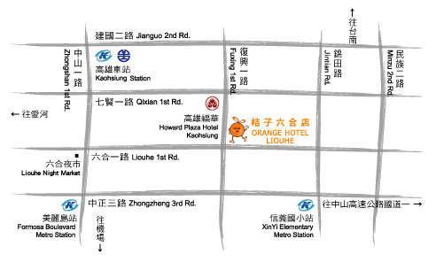 高雄新左營車站直接轉搭捷運至至信義國小站後步行約7分鐘;或美麗島站出10號出口,往六合一路方向直走約12分鐘至復興路興六合一路交叉口,即抵達福泰桔子商旅。