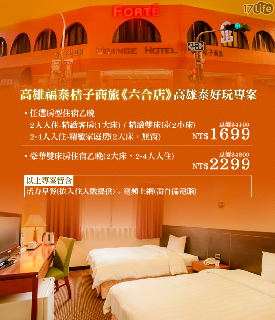 商品訊息簡述: 只要1999元起(2~4人價)即可享有【高雄福泰桔子商旅-六合店】原價最高4800元高雄泰好玩專案:(A)精緻客房(1大床)/精緻雙床房(2小床)/精緻家庭房(2大床,可住4人)住宿乙晚/(B)豪華雙床房住宿乙晚(2大床,可住4人)。以上專案均含:活力早餐(依入住人數提供)+寬頻上網(需自備電腦)。