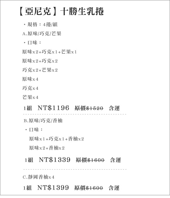 商品訊息簡述: 只要1196元起(含運)即可購得【亞尼克】原價最高1600元十勝生乳捲系列任選1組(4捲/組):(A)原味/巧克/芒果(多種搭配組合)/(B)原味/巧克/香柚(多種搭配組合)/(C)靜岡香柚。