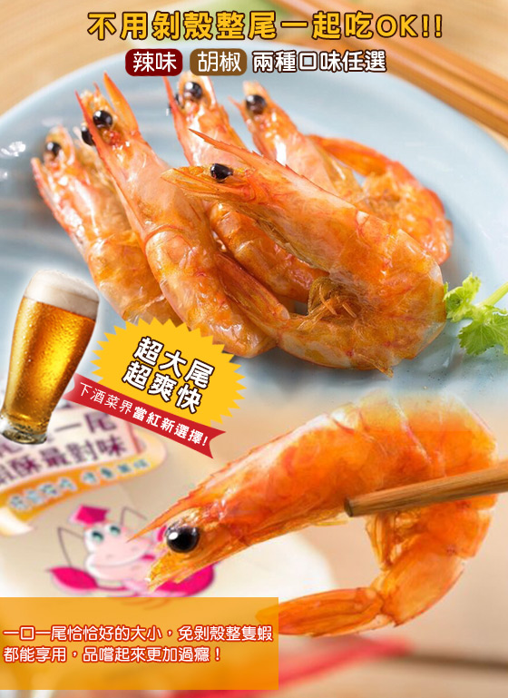一口一尾恰恰好的大小,免剝殼整隻蝦都能享用,撒點胡椒粉增添鹹香滋味,還有獨家特製辣椒粉,辣度十足品嚐起來更加過癮!
