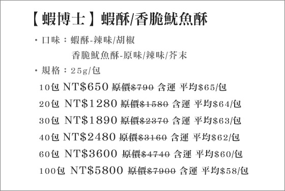 商品訊息簡述: 平均每包最低只要58元起(含運)即可購得【蝦博士】蝦酥/香脆魷魚酥10包/20包/30包/40包/60包/100包(25g/包),口味:蝦酥(辣味/胡椒)/魷魚酥(原味/辣味/芥末)。